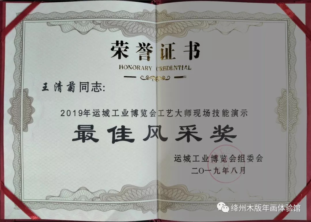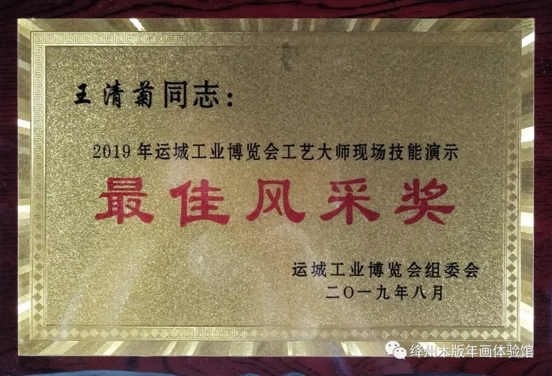 2019年8月21日——8月27日,在运城市农展中心成功举办了2019运城工业博览会,新绛县傲霜斋木版年画有限公司王清菊受邀参加并荣获2019年运城工业博览会工艺大师现场技能演示“最佳风采奖”。